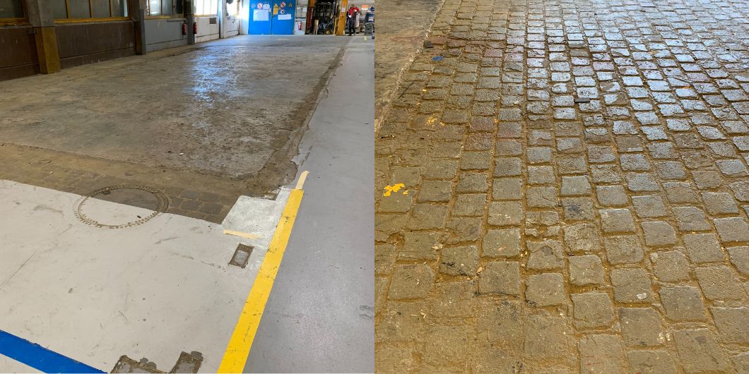 A long-standing client of Stonhard Germany for over 20 years, based in Hannover, encountered a significant issue with their factory floor during the dismantling of their spray paint shop. The process revealed a defective concrete and cobblestone factory floor.